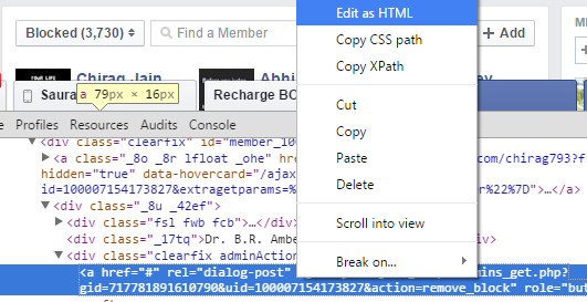 5. In highlighted line, you can see something like .. <a href=”#” rel=”dialog-post” ajaxify=”/ajax/groups/admins_get.php?gid=717781891610790&uid=100007154173827&action=remove_block” role=”button”>Remove Block</a>
