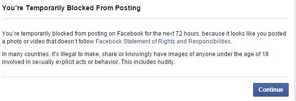 Well, This story is quite funny and strange too. Yesterday I tried to post one funny pic in one of my Facebook group and suddenly my account logged out automatically and after re-login, I got shocked after seeing Facebook warning pop up of “You’re temporarily blocked from posting on Facebook for the next 72 hours” . This is really strange for me, cause I just tried to share one funny pic which is not vulgar at all.